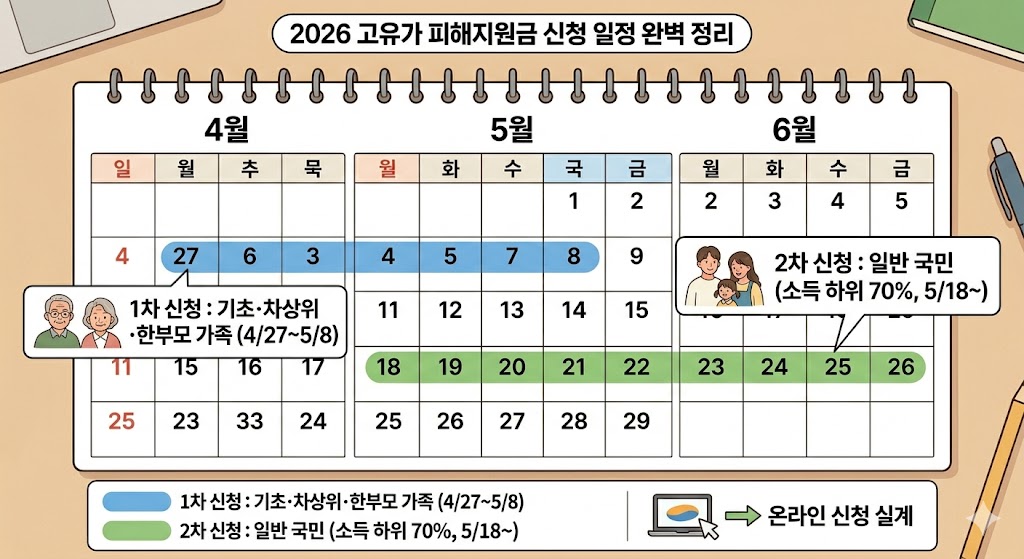 지원금 신청은 혼잡을 막기 위해 취약계층과 일반 국민을 나누어 1차, 2차로 진행됩니다. 특히 **신청 첫 주에는 출생연도 끝자리에 따른 요일제(5부제)**가 적용되니 본인의 해당 요일을 꼭 확인하셔야 합니다.