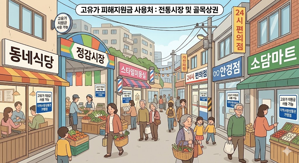 - 사용처: 본인 주소지 관할 지역 내 전통시장, 동네 마트, 식당, 미용실, 안경점 등 (대형마트, 백화점, 외국계 매장, 프랜차이즈 직영점 등은 사용 불가)