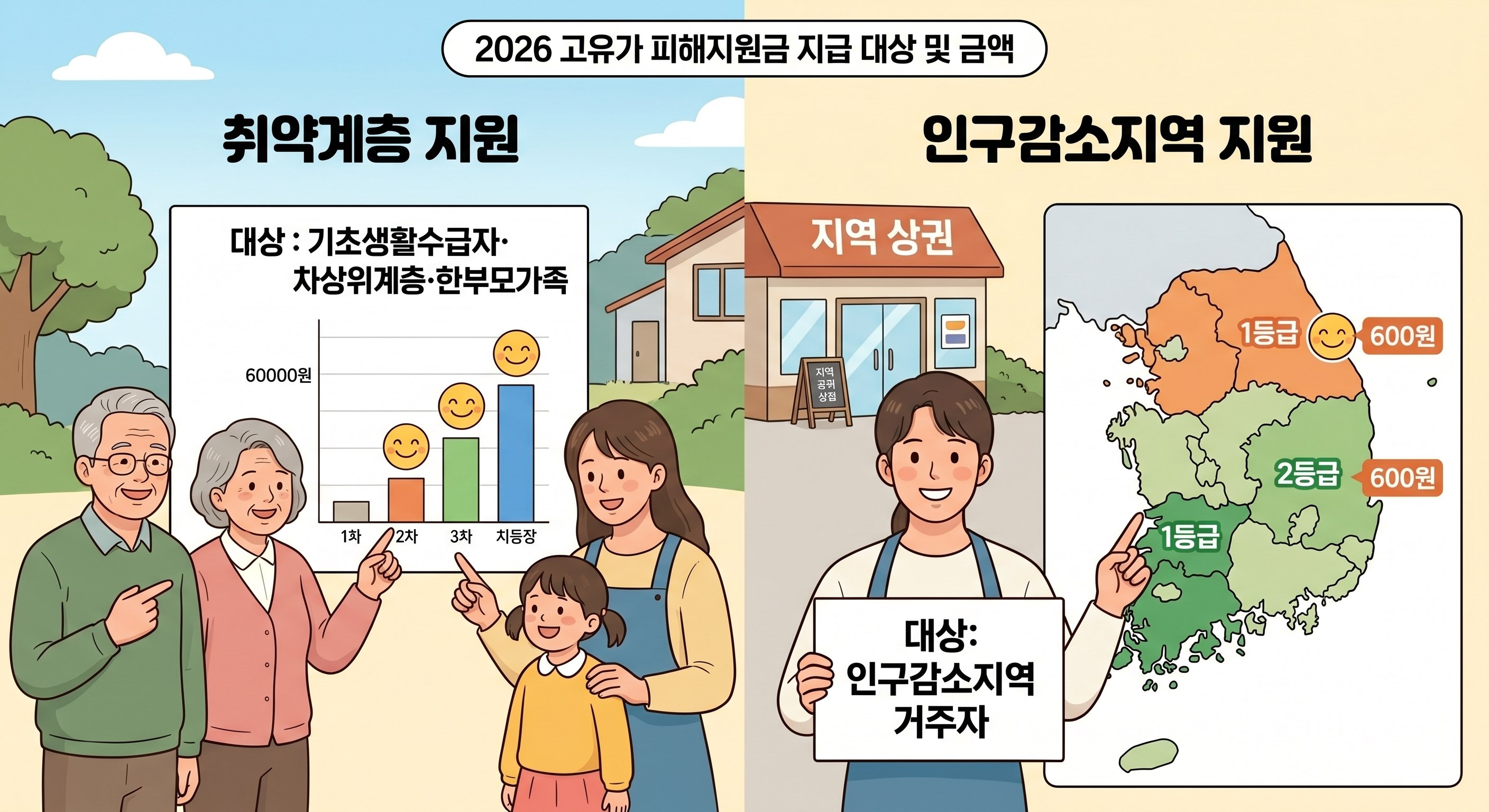 지원 대상은 소득 하위 70% 국민(기준 중위소득 150% 이하)이며, 가구원 수가 아닌 '1인당' 기준으로 지급됩니다. 취약계층일수록, 그리고 지방(인구감소지역)에 거주할수록 지원 금액이 더 높게 책정되어 있습니다.