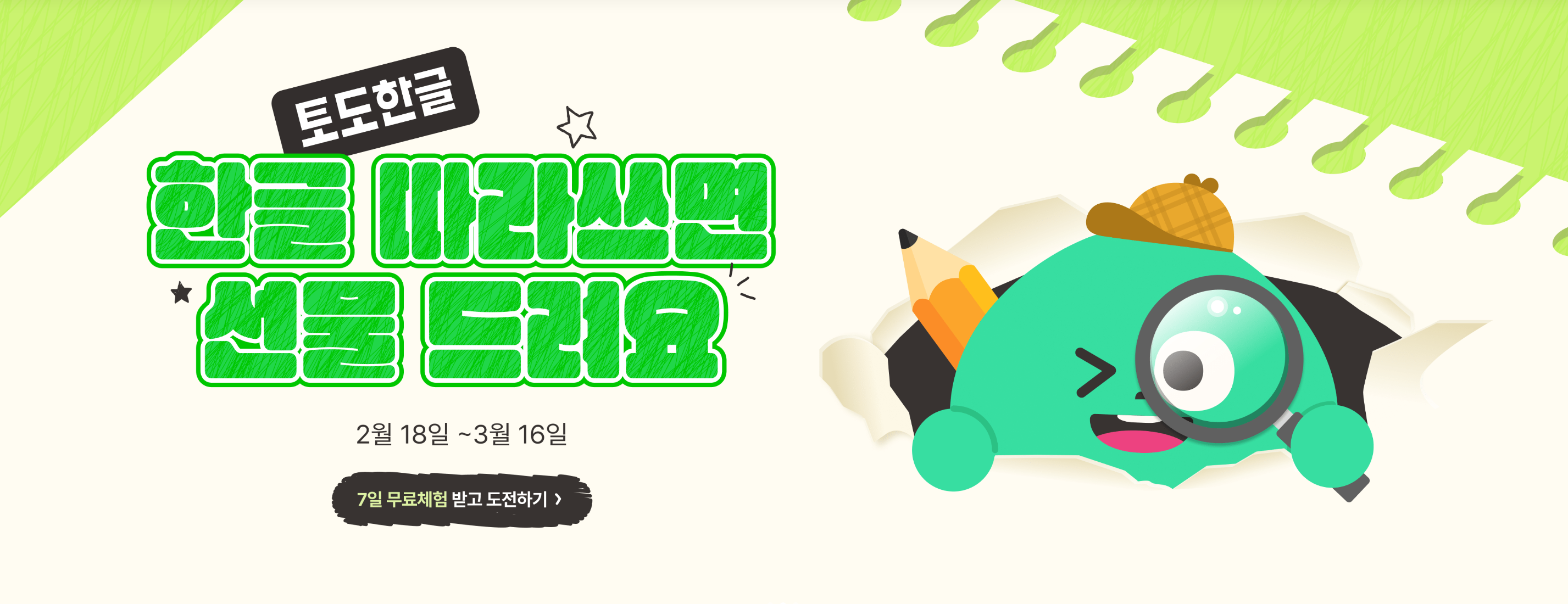💡 추천 이유: 재미있는 미션을 통해 영어를 자연스럽게 익힐 수 있어요. 매일 10분씩 학습하는 습관을 길러주기에 좋아요.