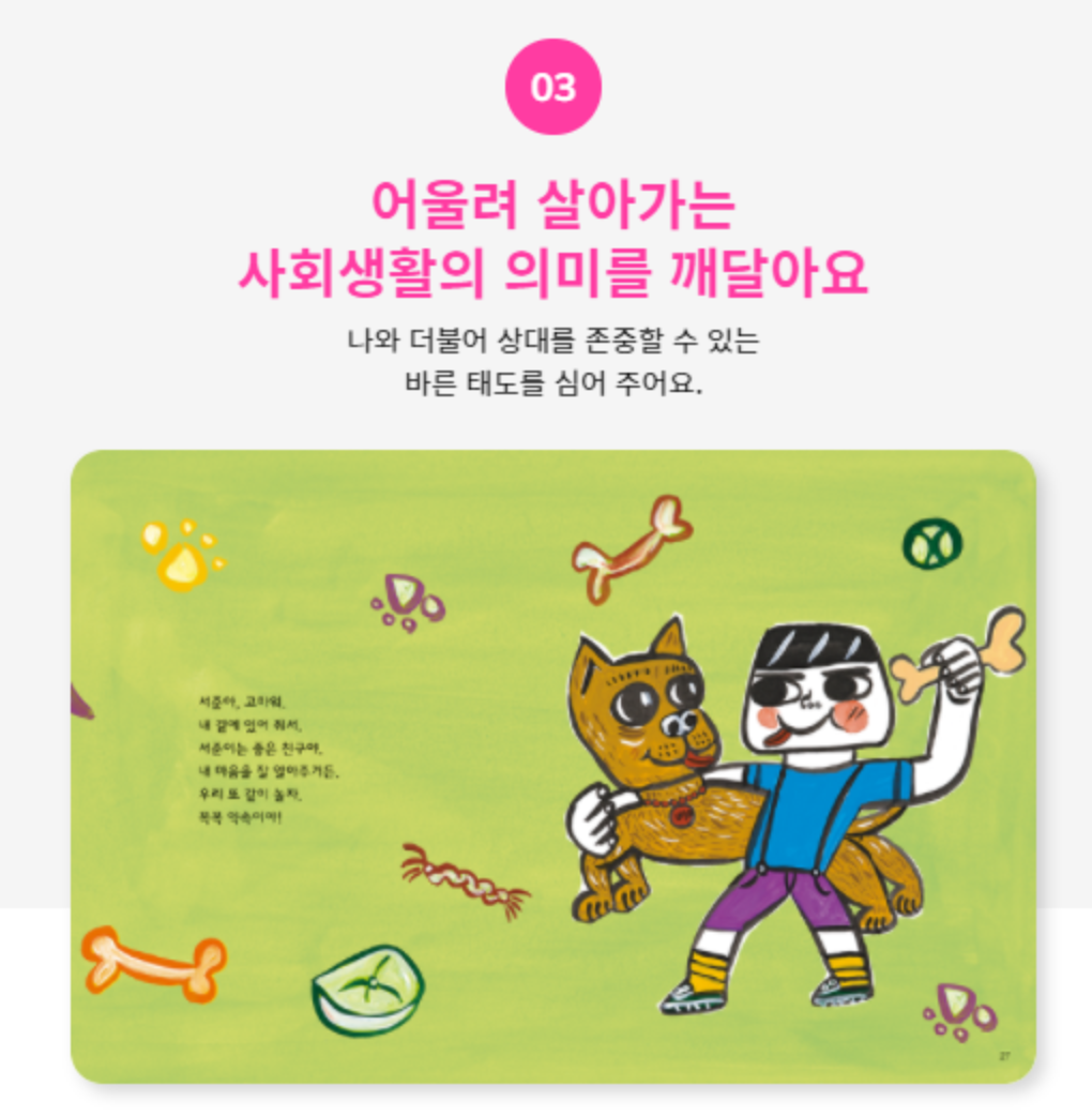 🌺 특징: '내 친구 사회공룡'은 아이들이 공동체 생활에서 필요한 사회성, 규칙, 역할, 갈등 해결 등을 재미있게 배울 수 있는 전집입니다. 유치원과 일상 속에서 마주할 수 있는 다양한 사회적 상황을 재현하며, 스스로 규칙을 이해하고 존중하는 법을 이야기 속에서 자연스럽게 체득할 수 있도록 돕습니다. 각 권에는 놀이 활동 자료도 포함되어 있어 놀이와 학습이 결합된 구성이 특징입니다.