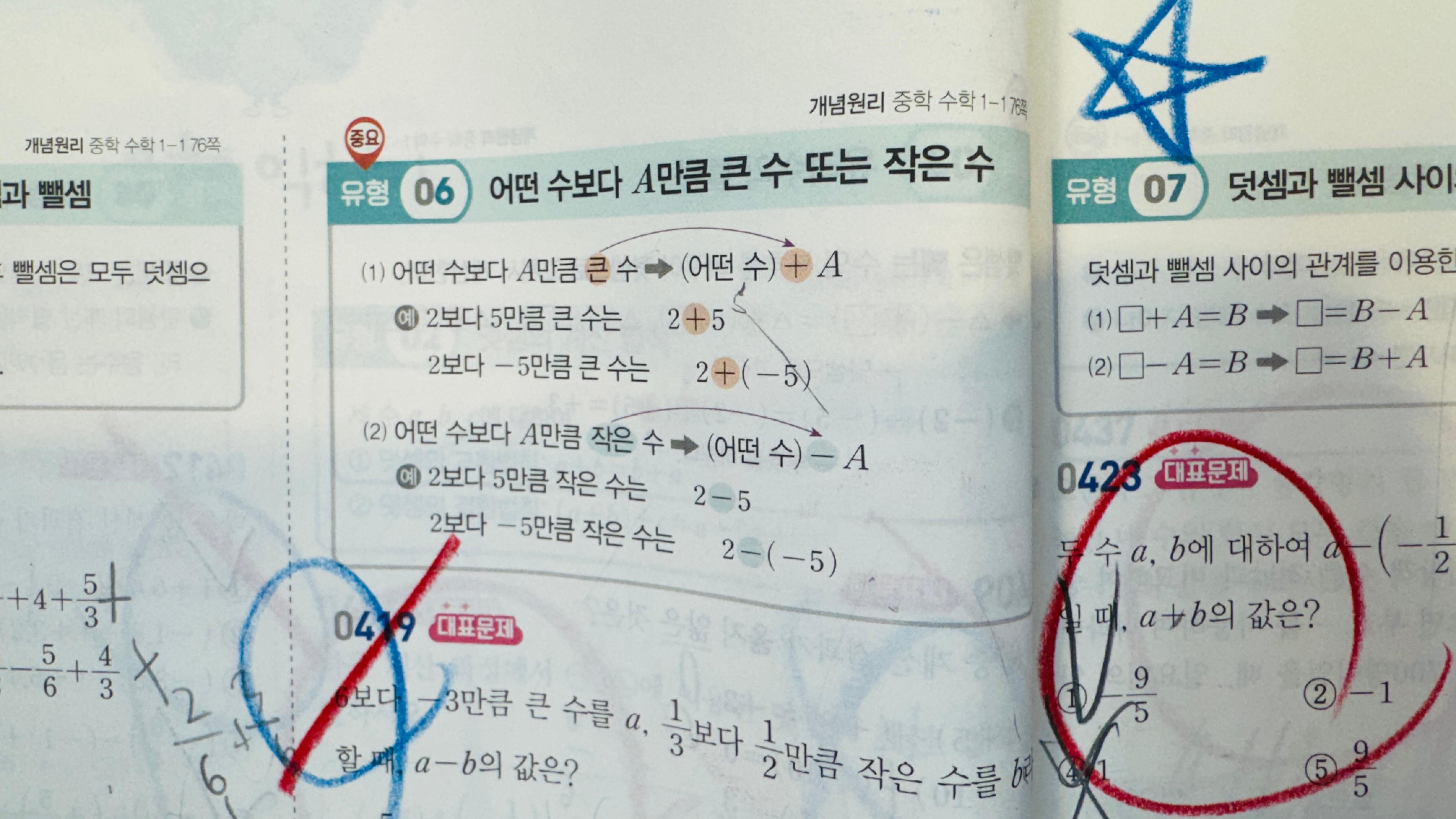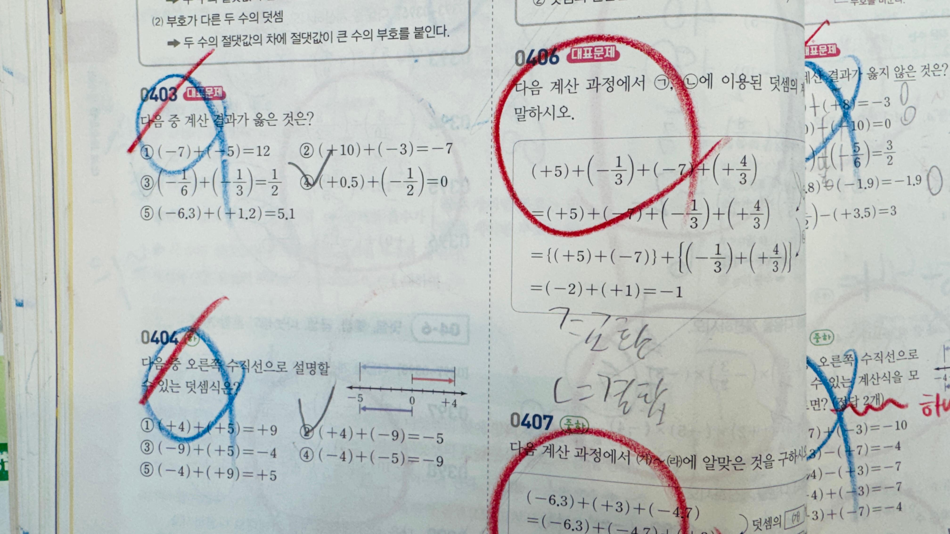 부호가 섞이기 시작하면 아이들은 암산을 하다가 오답을 냅니다. "왜 -(-7)이 +7이 되는지" 논리적으로 이해하지 못하고 요령만 외운 아이들은 조금만 문제가 꼬여도 틀립니다.
