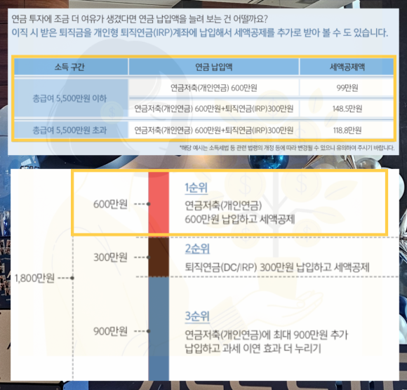 따라서 자금이 장기간 묶이는 것이 부담스럽다면 연금저축 600만 원 한도부터 채우고, 여유가 될 때 IRP를 추가하는 순서를 추천합니다.