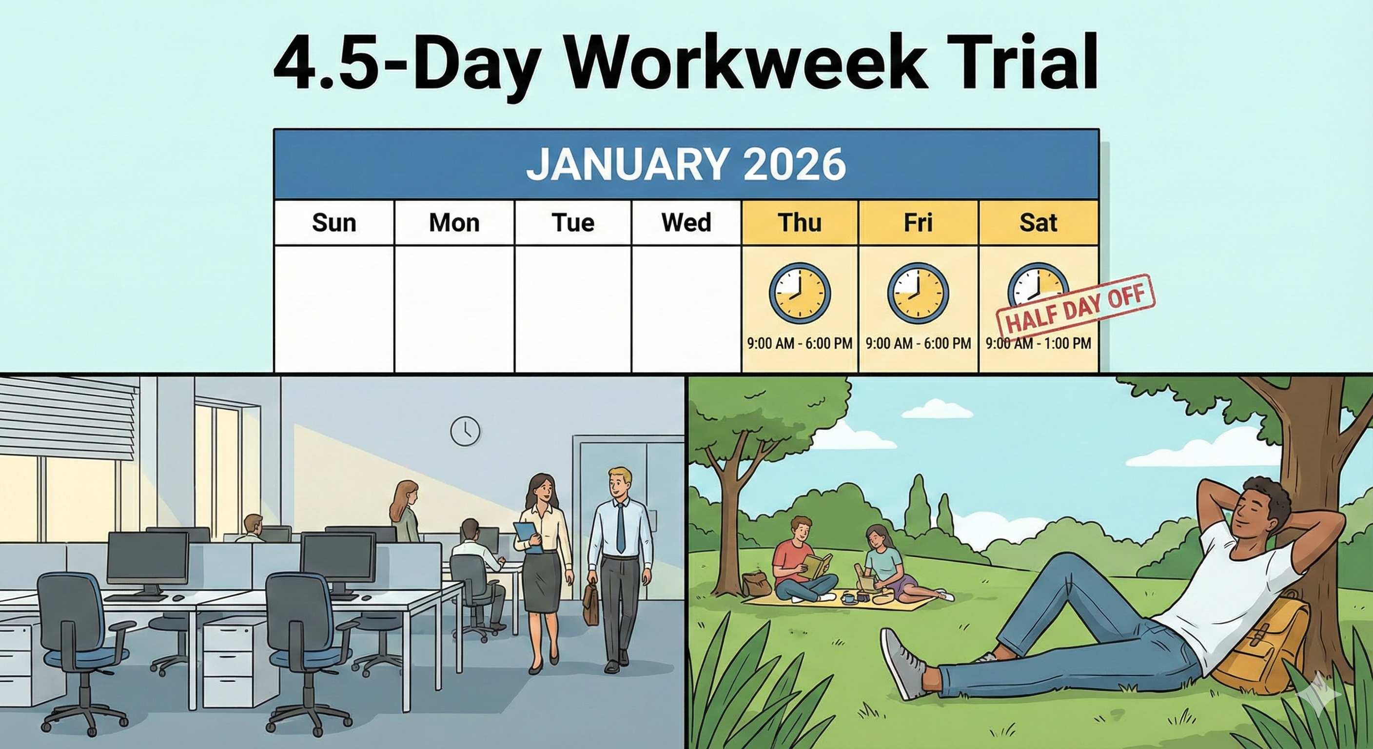 - 주 4.5일제 시범 도입: 워라밸을 중시하는 흐름에 맞춰 '주 4.5일제'가 시범 도입됩니다. 금요일 오후를 비우거나 근무 시간을 유연하게 줄이는 방식으로, 정부와 공공기관 및 일부 기업을 중심으로 내년부터 본격적인 시범 운영이 시작됩니다.