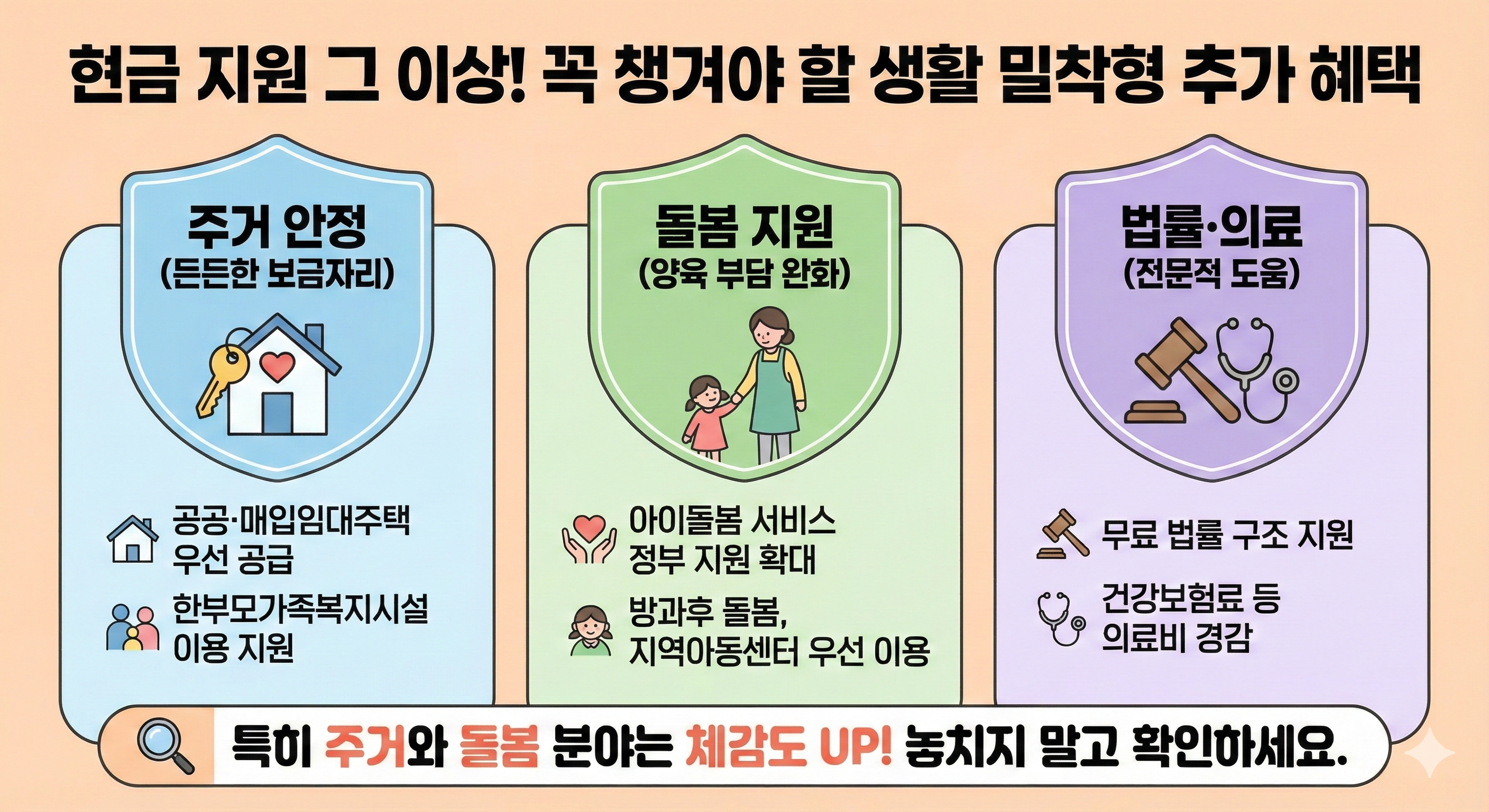 2026년 한부모가족 정책은 지원의 사각지대를 없애고, 지속 가능한 가정을 만드는 데 목표를 두고 있습니다. 기준 중위소득 65% 완화와 양육비 선지급제 도입은 많은 분에게 새로운 희망이 될 것입니다.
