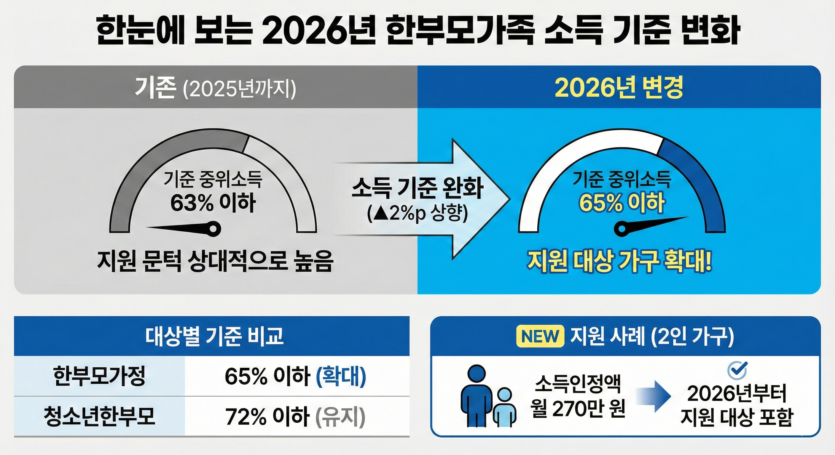 • 한부모가정: 기준 중위소득 63% → 65% 이하로 확대