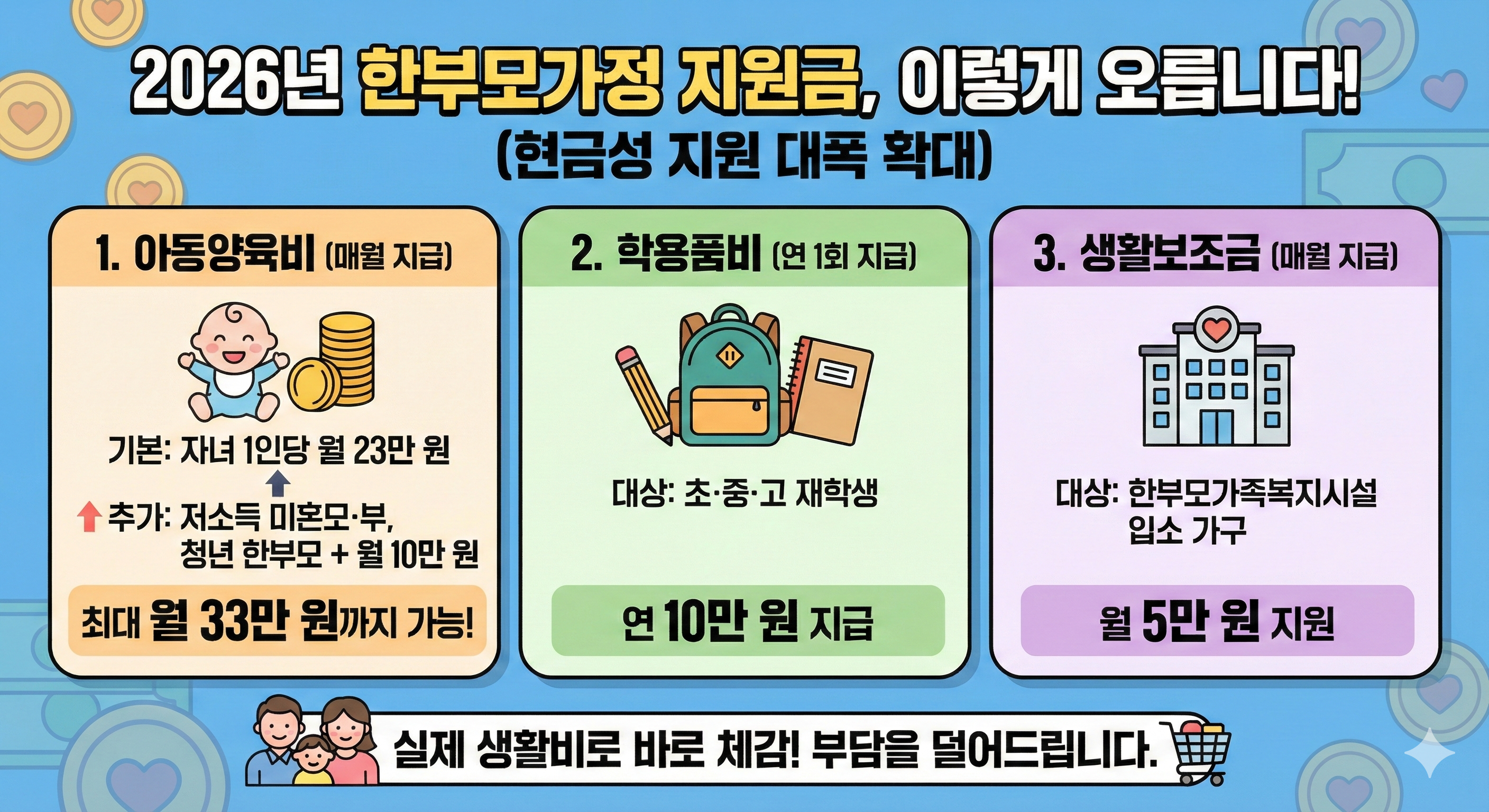 이러한 지원금은 단순한 보조금을 넘어, 아이를 키우는 데 필수적인 생활비 보전에 큰 역할을 할 것으로 기대됩니다.